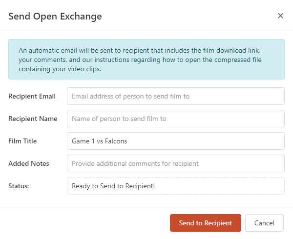 A simple and open way of exchanging film with opponents who may be using a different film management system such as Hudl. We see many teams use Open Exchange when they get to the playoffs and are trading film with teams they normally do not know. Open Exchange allows a coach to give another coach access to a film without requiring that coach to log on or use WatchGameFilm.