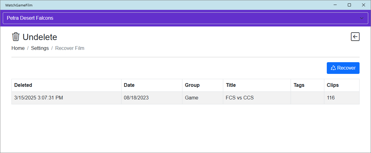 Recover Film allows staff to recover recently deleted films before they are permanently removed from the system, similar to a recycle bin on your computer.